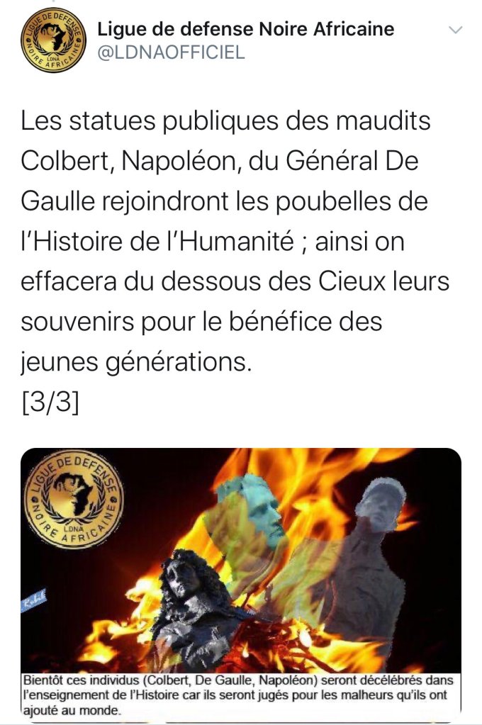 Sans rien attendre des macronistes qui considèrent que Castaner est un bon ministre, nous attendons toujours, avec Bruno Retailleau et d’autres personnalités de tous horizons, qu’il agisse lorsque par exemple, dernièrement, un des collectifs totalitaires qui a organisé la manif « interdite mais autorisée quand même » s’autorise à représenter le Général de Gaulle dévoré par les flammes, au milieu d’un bûcher dont émerge les statues de Napoléon 1er et de Colbert (voir ci-dessous) :