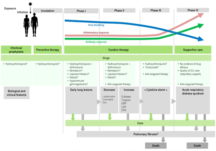 Le schéma ci-dessous indique quel médicament apporter en fonction du stade de la maladie. Chez les moins de 50 ans, la disparition de l’odeur est le meilleur signe prédictif. Chez le sujet âgé, ce sera la fièvre, la toux et des difficultés respiratoires avec une évolution beaucoup plus grave.