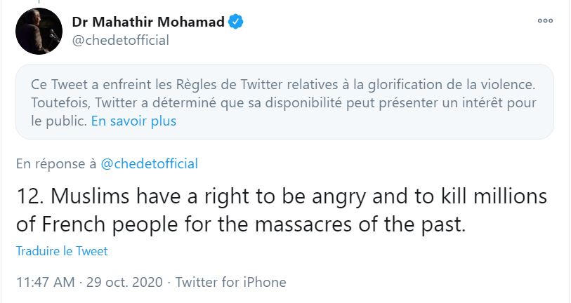 Le réseau social Twitter a refusé de bloquer cette série de messages doublée d’un billet de blog nommé « respectons les autres » de l’ancien premier ministre de Malaisie de 1981 à 2003 et de 2018 à 2020, Mahathir Mohamad, qui appelle les musulmans à tuer des millions de français. Nous le reproduisant ci-dessous: