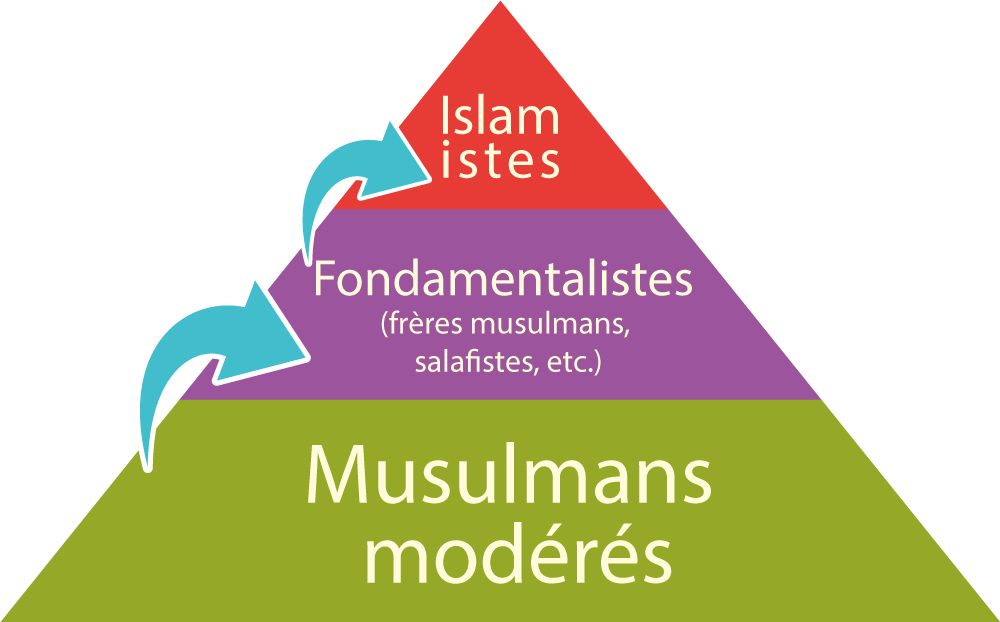 Point important, il existe une porosité de plus en plus importante entre musulmans modérés et fondamentalistes est à l’œuvre. Et la première étape vers le djihad violent. Ce schéma synthétise (hors proportions) ces trois étages de la pyramide.