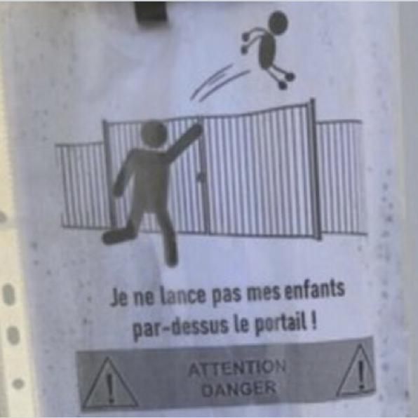 Depuis, deux affichettes sont été affichées sur le portail de l’école. La première dit “Je ne lance pas mes enfants par-dessus le portail !” et la seconde: “Quand je suis en retard, je reviens à 10 heures, ou 15 heures”.