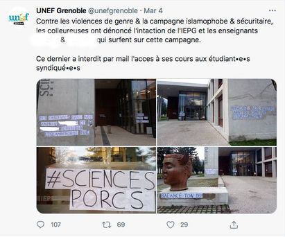L’islamo-gauchisme a trouvé une éclatante démonstration supplémentaire non seulement de son existence, mais aussi de sa répugnance, à l’Institut d’Etudes Politiques (Sciences Po) de Grenoble. Jeudi 4 mars 2021, l’entrée de l’établissement était flanquée d’inscriptions en grosses lettres, accolant le nom de 2 professeurs de longue date, Vincent T. et Klaus K. (NDLR: nous dissimulons les noms), ainsi qu’une caricature de l’un d’eux aux inscriptions « Des fascistes dans nos amphis » et « l’islamophobie tue ». Ces messages haineux ont été repris sur plusieurs comptes sociaux de gauche, notamment l’UNEF (syndicat bien connu dans ce type d’accusations) de Grenoble sur sa page Twitter (capture ci-dessous).