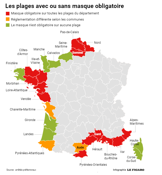 Les préfets, sous l’autorité de la Macronie, nous ont coloré la France avec leurs plus beaux crayons de couleurs. Séparant le littoral français entre les plages où l’on doit porter le masque (en rouge) et d’autres, (en vert ou orange) non.