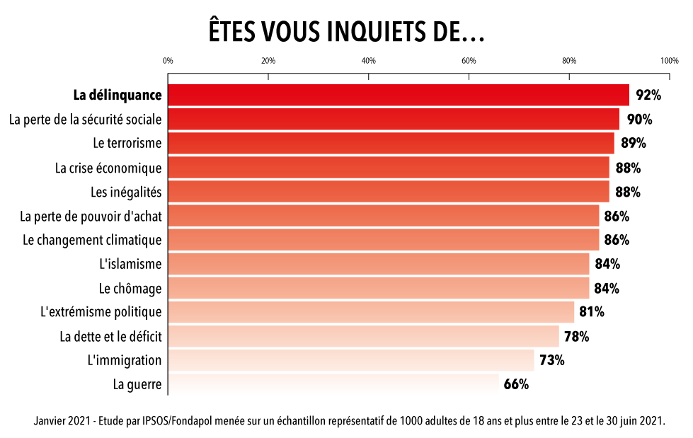 Toujours dans cette étude, d’après l’IPSOS pour la Fondation pour l’innovation politique*, il est également important de souligner que 71% des français pensent que la société va devenir de plus en plus violente, contre 54% des répondants de la moyenne des européens interrogés. Du côté des peurs exprimées par les français, parmi 13 items possibles, on trouve la délinquance en première position (avec 92% de réponses positives exprimées), et l’immigration et la guerre fermant la marche bien loin derrière (Voir ci-dessous).
