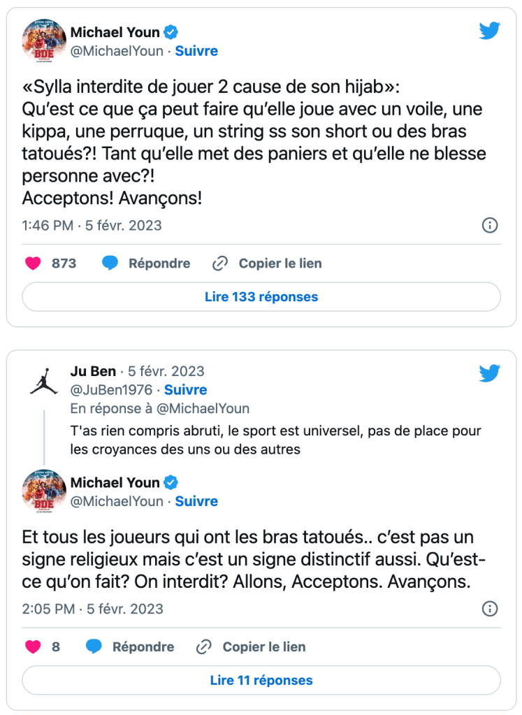 Il faut savoir que le règlement national de la Fédération Nationale de Basket-Ball (FFBB) interdit de se couvrir les cheveux à part un bandeau de 10 centimètres de hauteur. Elle est allée défendre sa cause devant la caméra complaisante du Parisien et d’un de leurs journalistes qui travaille pour AJ+ (Al Jazeera). Ce genre d’incident n’est pas isolé. Une autre joueuse a déjà été exclue du terrain en janvier 2023.